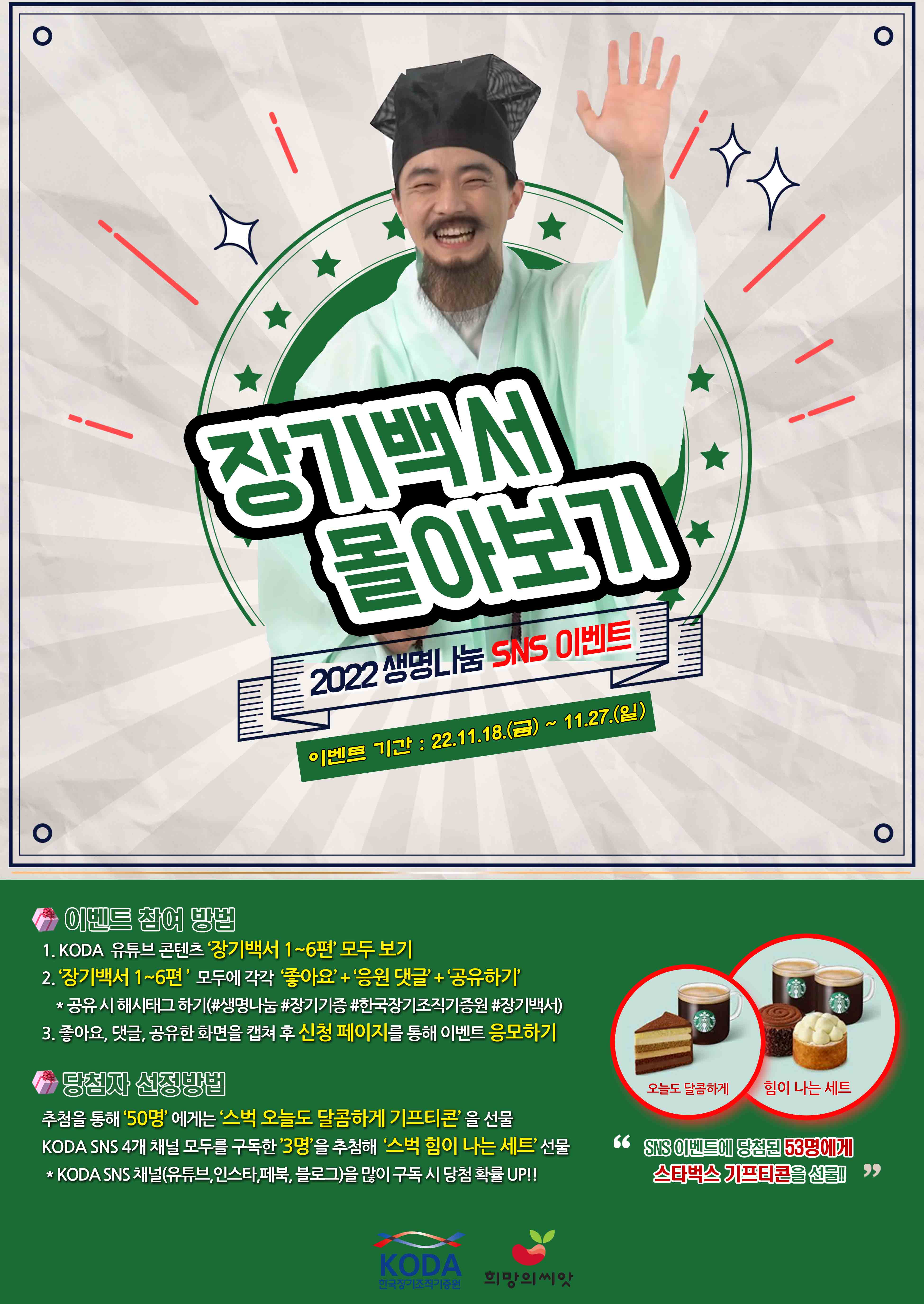 장기백서 1~6편을 모두 시청하고 댓글 + 좋아요 + 공유하기를 한 분들 중 추첨을 통해 스벅 기프티콘을 선물합니다