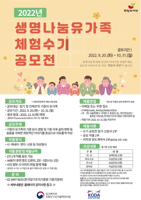 공모 주제는 기증자 유가족의 기증 당시 경험 및 기증 이후 삶의 변화 등 슬픔을 극복한 희망적인 이야기 등을 주요 소재로 자유롭게 작성하며, 참가대상은 뇌사장기기증 및 인체조직기증자 유가족이다